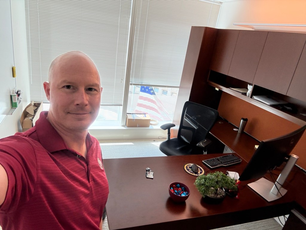 Friday I turned in my HHS equipment and left the office for the last time, and finally got a picture of me with the monster American flag in the background. I will miss the amazing people in ASPR as well as our amazing partners, but the timing is absolutely right.