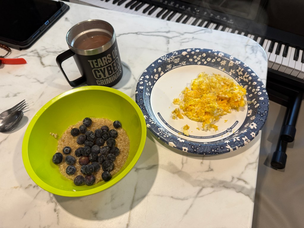 I was definitely suffering last night, tired from the poor sleep the night before and then from overdoing it on the hike. Then to top it off I couldn’t get the heat to run as the temps outside dropped to the mid 30s. Fortunately there were plenty of blankets, though I still ended up wearing sweat pants and a long sleeve shirt to bed when I finally gave up at about 8:00 PM. Unfortunately I had a pretty bad headache, my body was hurting and I just couldn’t sleep. Oh, and I got another 2 warnings about abnormal heart rate since it was still up over 100 for most of the night. So another kinda rough night. I finally crawled out of bed to make breakfast around 8:00 – scrambled eggs and oatmeal with blueberries (the usual) with a hot chocolate (did I mention I was cold?) and then filled the pan with water and put it back on the stove to heat up the RV a bit.