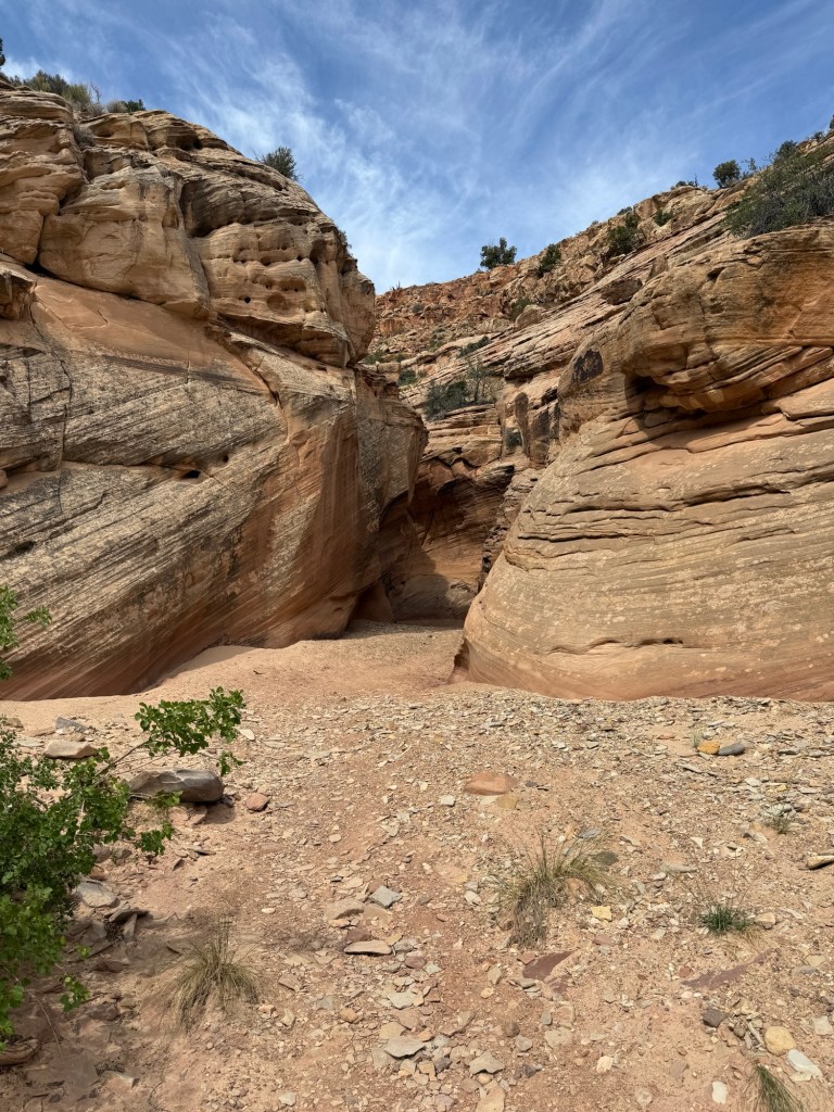 Once I got up for real I finalized plans for the day, which unfortunately did not include ,y first choice for slot canyon hike. Peek-a-boo and Spooky slot canyons require a 26 mile drive on a dirt road where multiple people noted seeing more than a one muffler along the way. The RV has enough problems, and that seemed excessive. Instead I headed to Cottonwood Wash for what I planned on was a 6.5 or so mile hike with the far end of the out and back being the true slot canyon. The hike through the wash and the canyon were both annoying and cool – lots of loose sand but some spectacular views as usual.