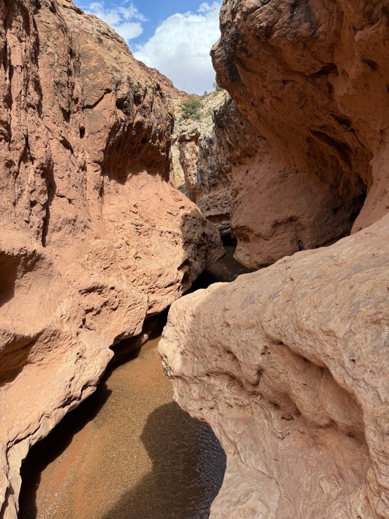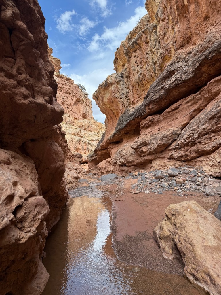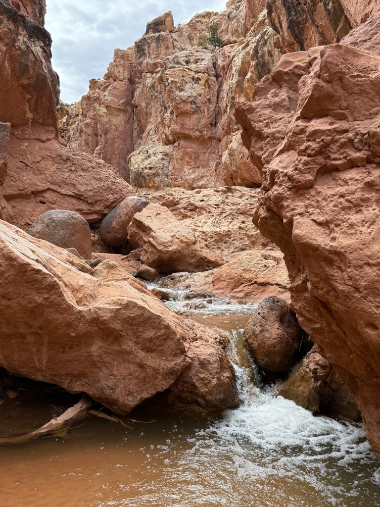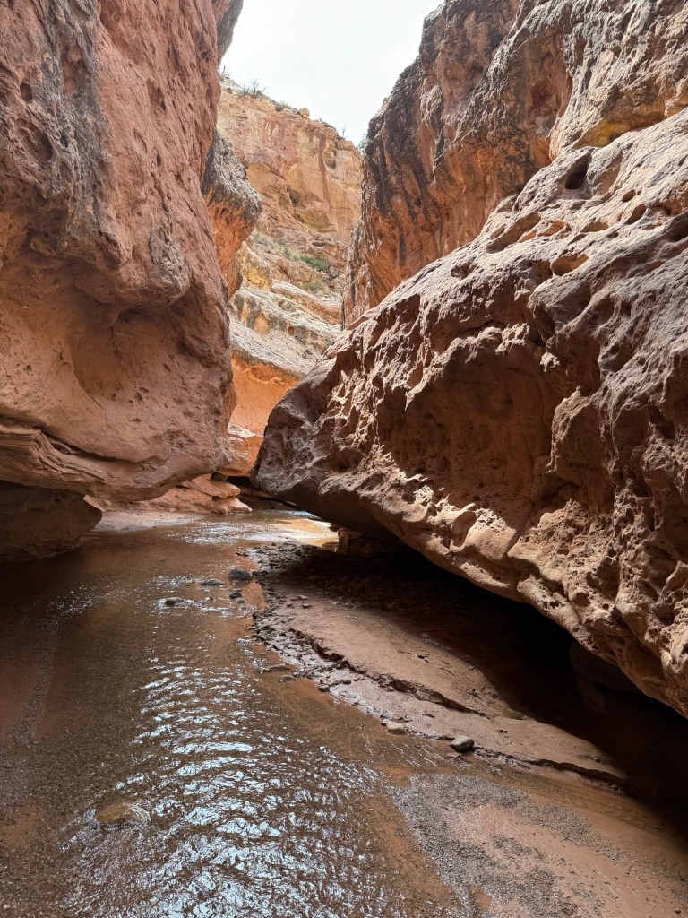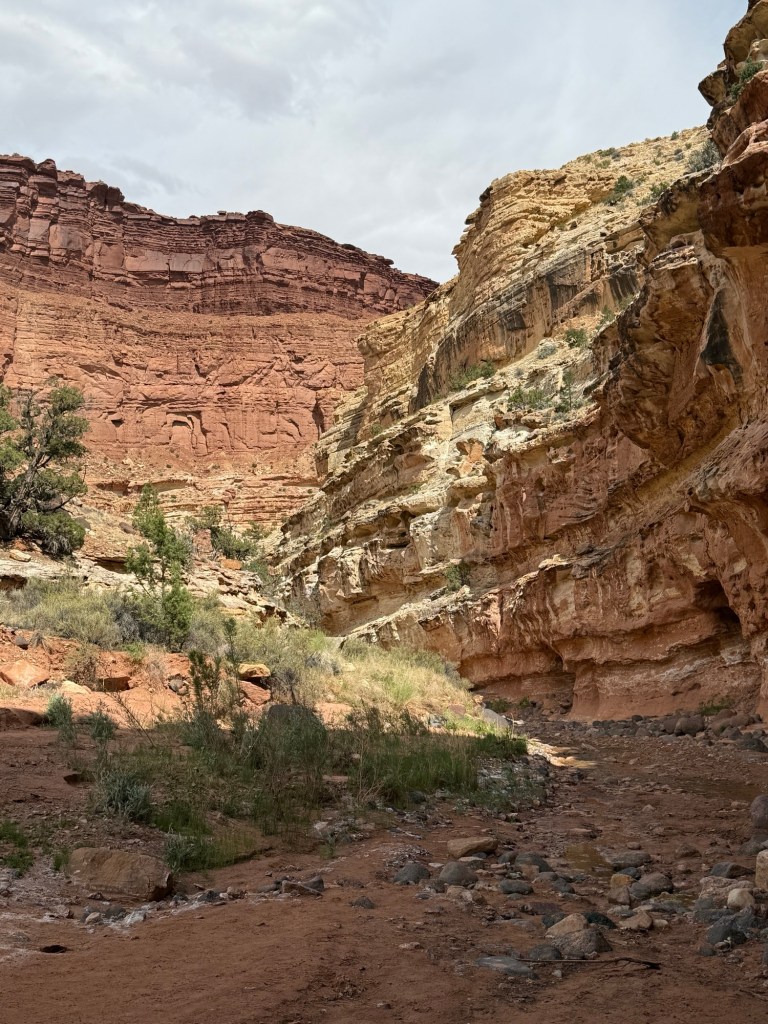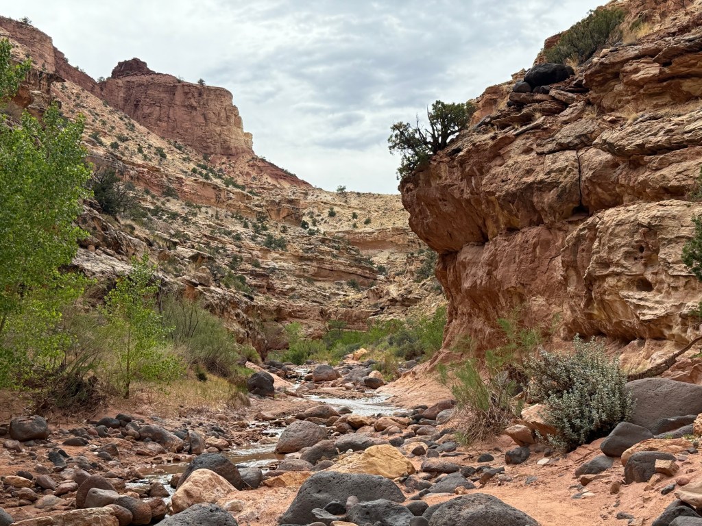 The clouds and the radar cleared up early afternoon, and I found the website where NPS lists flash flood risks, and Capitol Reef was low/non-existent, so I decided to head back to do more of Sulphur Creek, this time starting from the “top”. The entire trail is 5.9 miles, and I covered 2 of those this morning starting from the bottom.