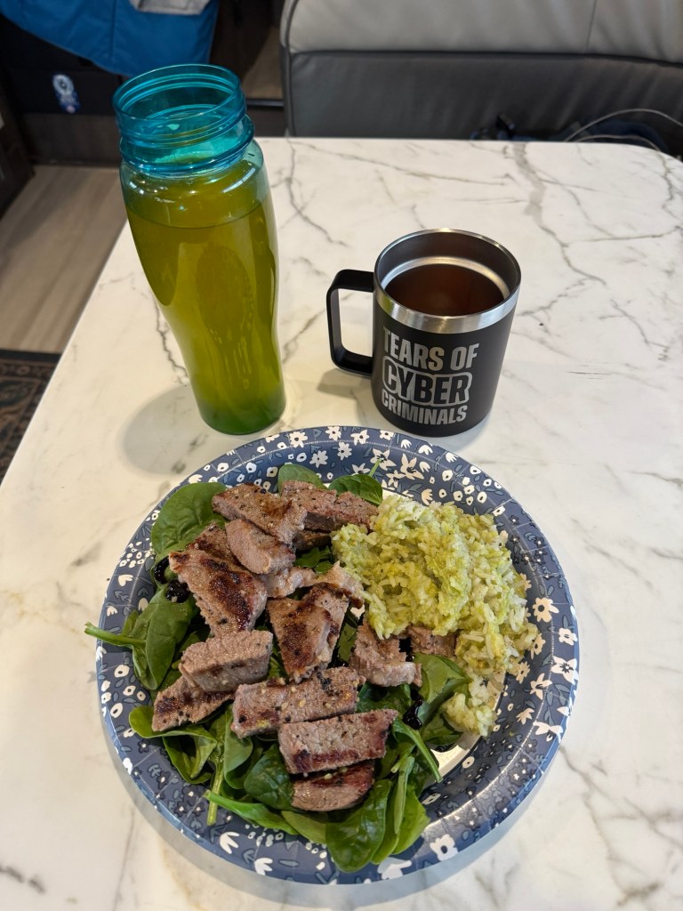 I wrapped up the evening by grilling some steak with a sort-of herbed butter sliced on top of spinach with a mix of rice and guac on the side. I have been told that was an interesting combination, and honestly I can argue with that comment, but it tasted really good and hit the spot.