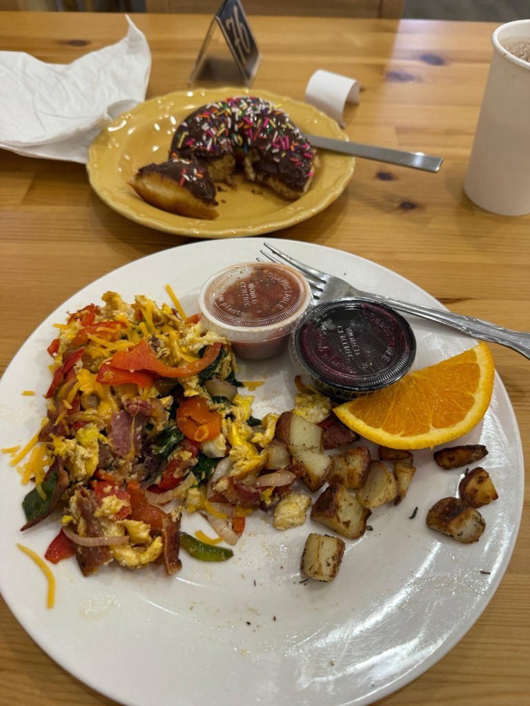 Breakfast was tasty at the Wild Rabbit Cafe, where I enjoyed a scramble, seasoned potatoes, a donut and hot chocolate. All quite tasty.