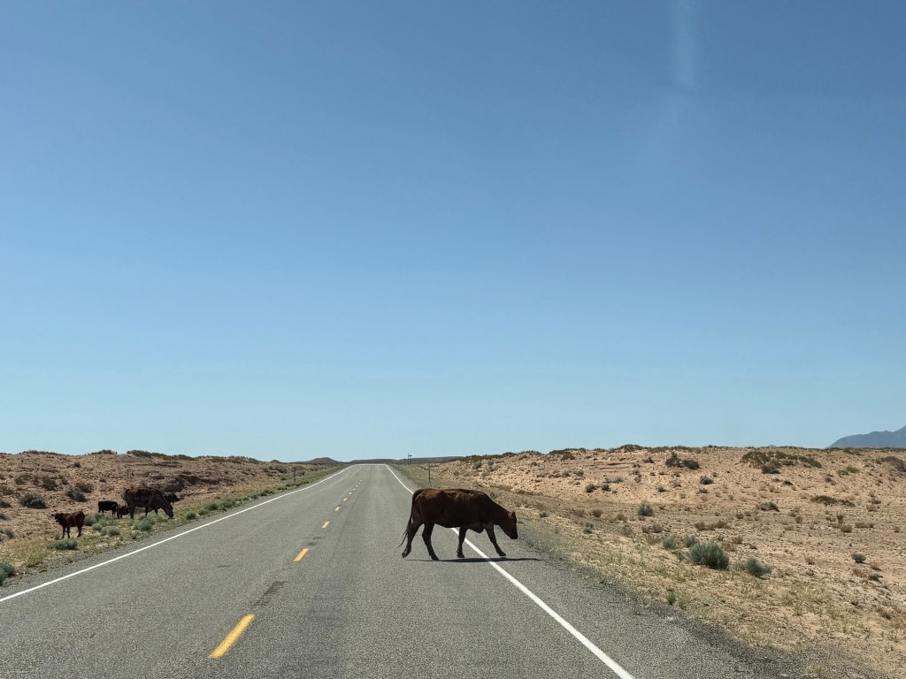 I also spontaneously rearranged the fridge and everything else in the RV when a ninja cow launched itself into the middle of the road. Ok, that might be a bit of an exaggeration, but I did have to slam on the breaks when a cow that was calmly grazing along the other side of the road looked up, made uncomfortably direct eye contact, and then proceeded to walk into the middle of the road and stop.