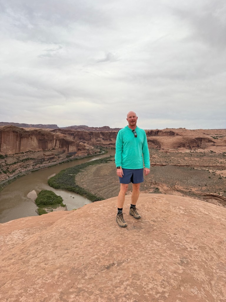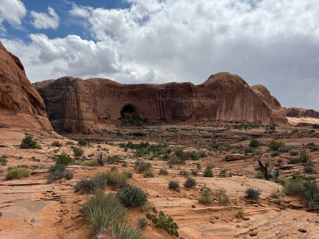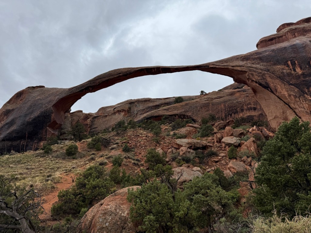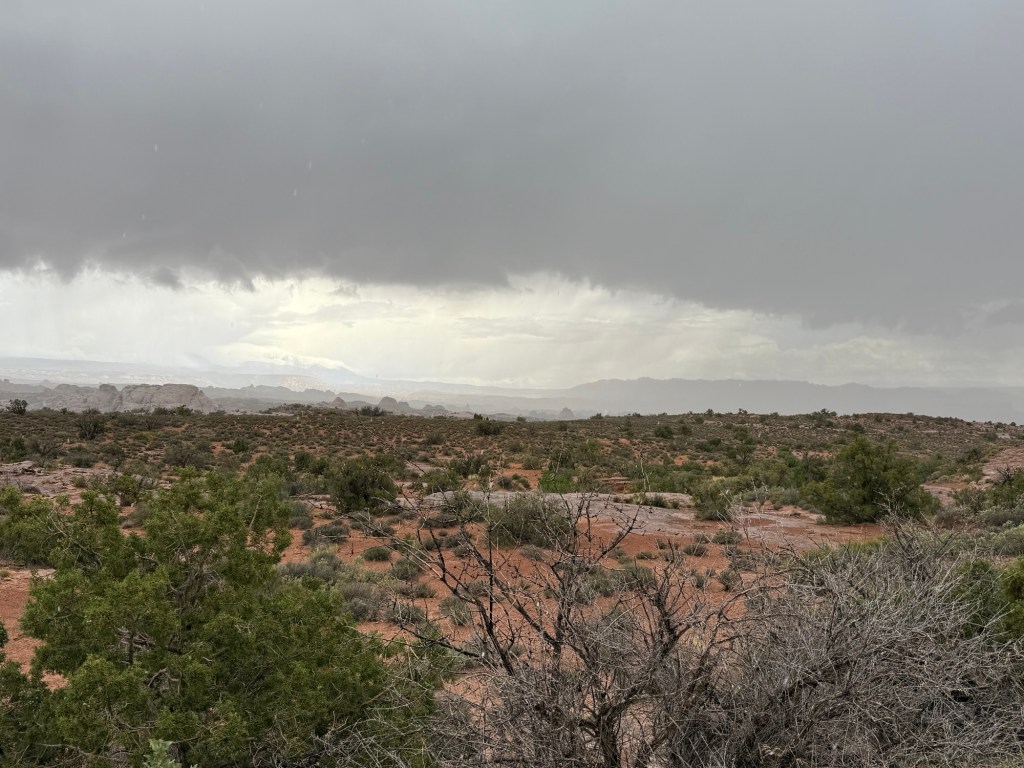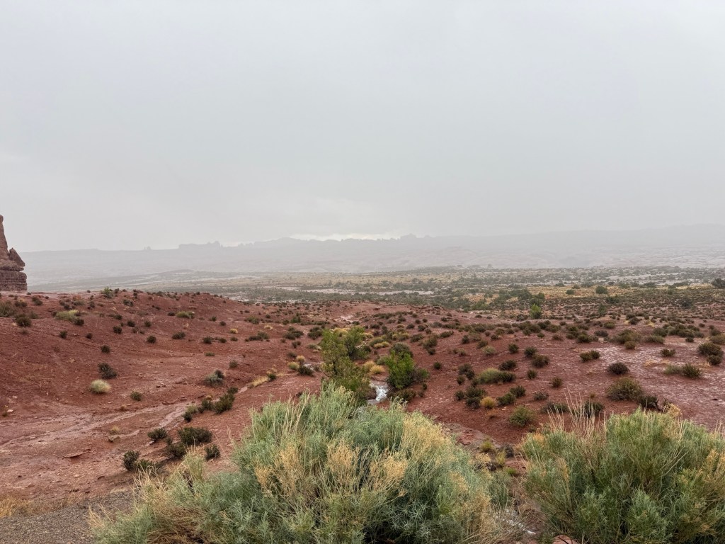 I started early this morning to get in the park before the timed entry stuff started, and went straight to Wolfe Ranch to hike up to Delicate Arch. It was overcast and breezy to start, but up at the arch it was downright cold and high winds. And then the rain started. I didn’t hang around very long before heading back down in the drizzle.
