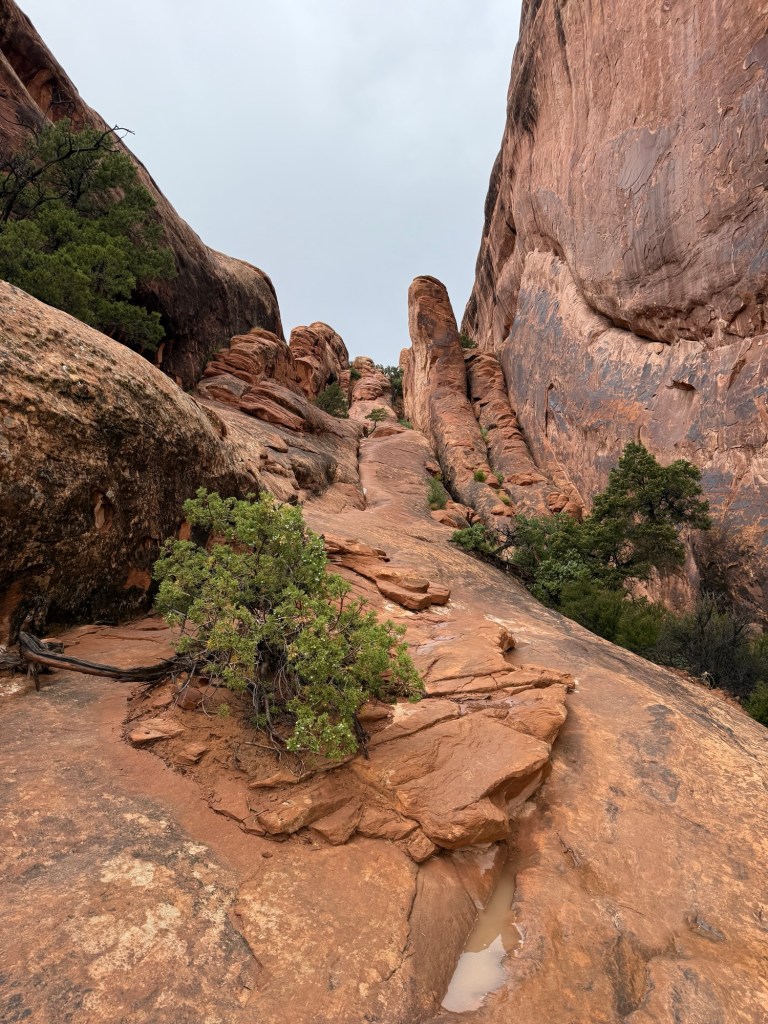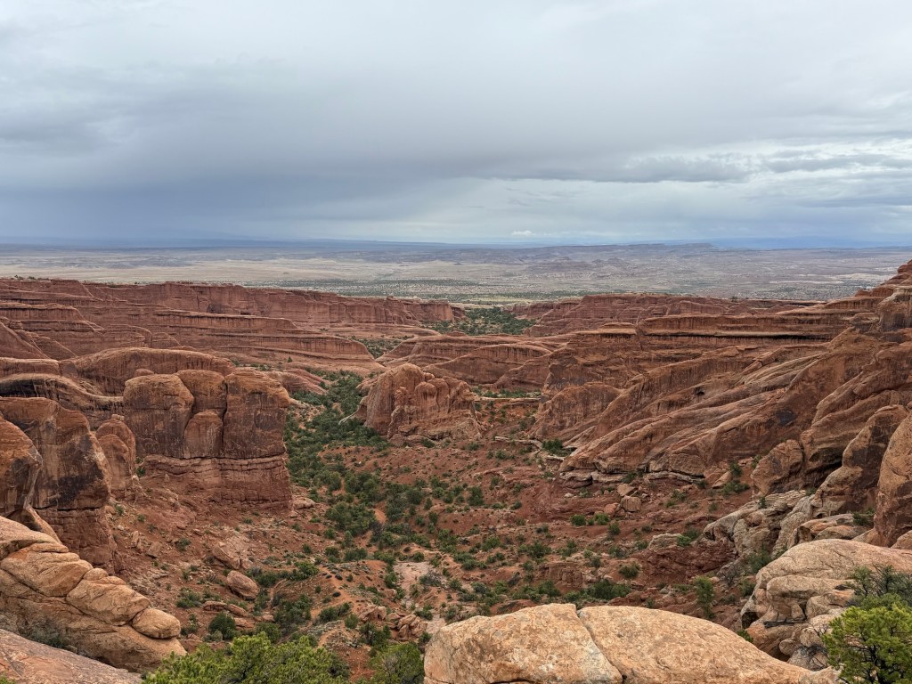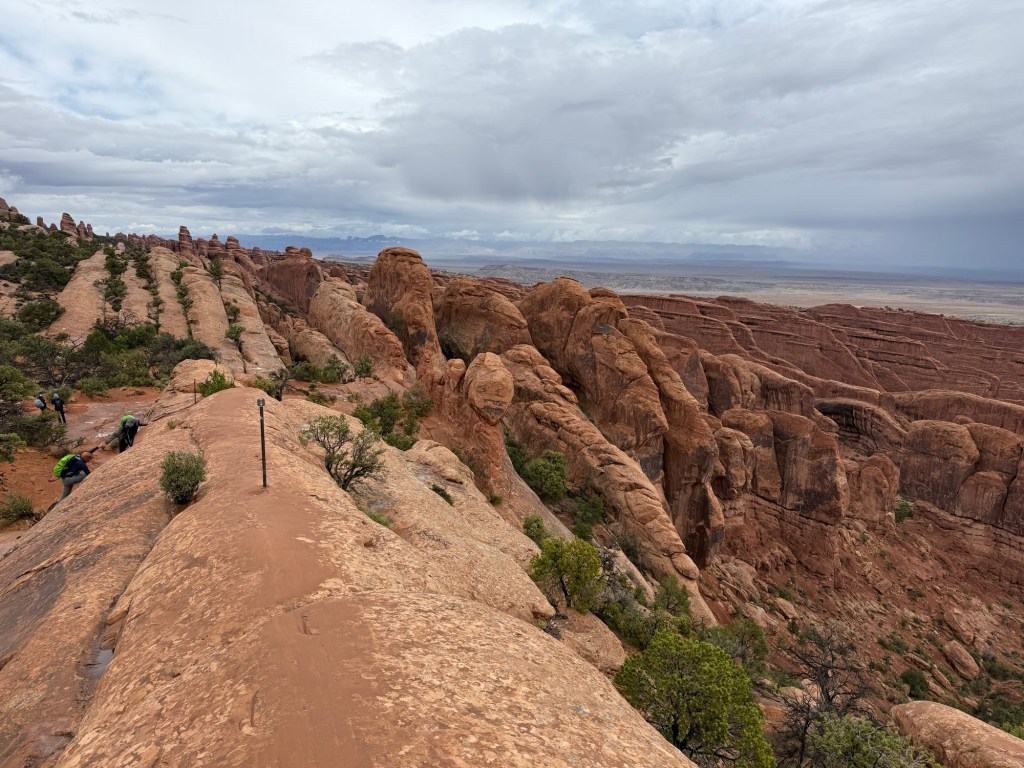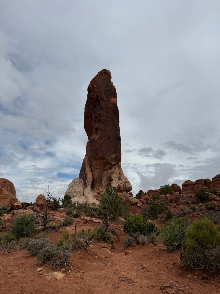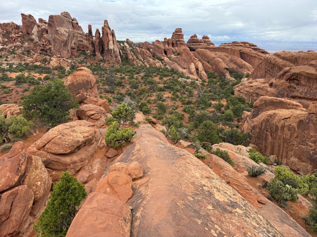 Once u got back to the RV I made eggs and hot chocolate for breakfast while listening to the now-heavier rain. It didn’t really seem to discourage people, as they continued to head up the trail to see the arch. After breakfast I drove around a little and ended up at the parking lot for Devil’s Garden, though it was still raining. I sat for a little bit, then decided to get my rain gear together and give it a try. By the time I actually got out the door the rain had stopped, so off I went. I ended up doing the full primitive trail loop, about 8 miles with all the spur trails. Good thing I had the All Trails app, s it asked me a couple of times if I was of course. Yes, yes I was. Anyway, that trail was no joke, but the views were unbelievable, so it was worth it in the end.