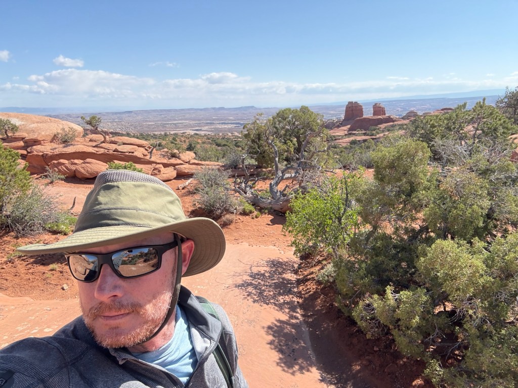 This morning, I was up early again to try and get a decent sunrise in Arches National Park, and did pretty well catching the sunrise at windows or double arches. After that, I drove up to panorama point to make breakfast and decide what to do next. I ended up driving back up towards Devils Garden and hiking Sand Dune and Tapestry Arch, and once again got pretty windy and parked so I had to put my Tilly hat into sport mode a couple of times.