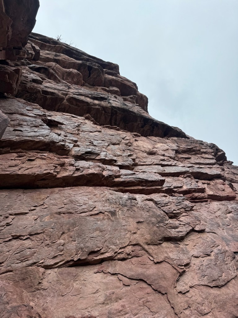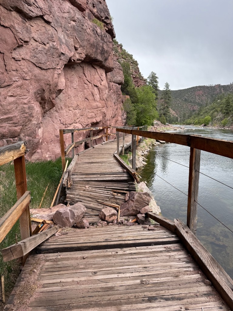 There was one other interesting thing on the hike today. A rockfall landed on and destroyed part of the hiking trail bridge, which definitely made me a bit nervous, even about just sheltering under a ledge during the heaviest of the rain. I did check out the top of the cliff above the rock fall. If you look closely enough you can see the head of Wile E. Coyote sticking out over the edge and nobody can tell me differently 😜
