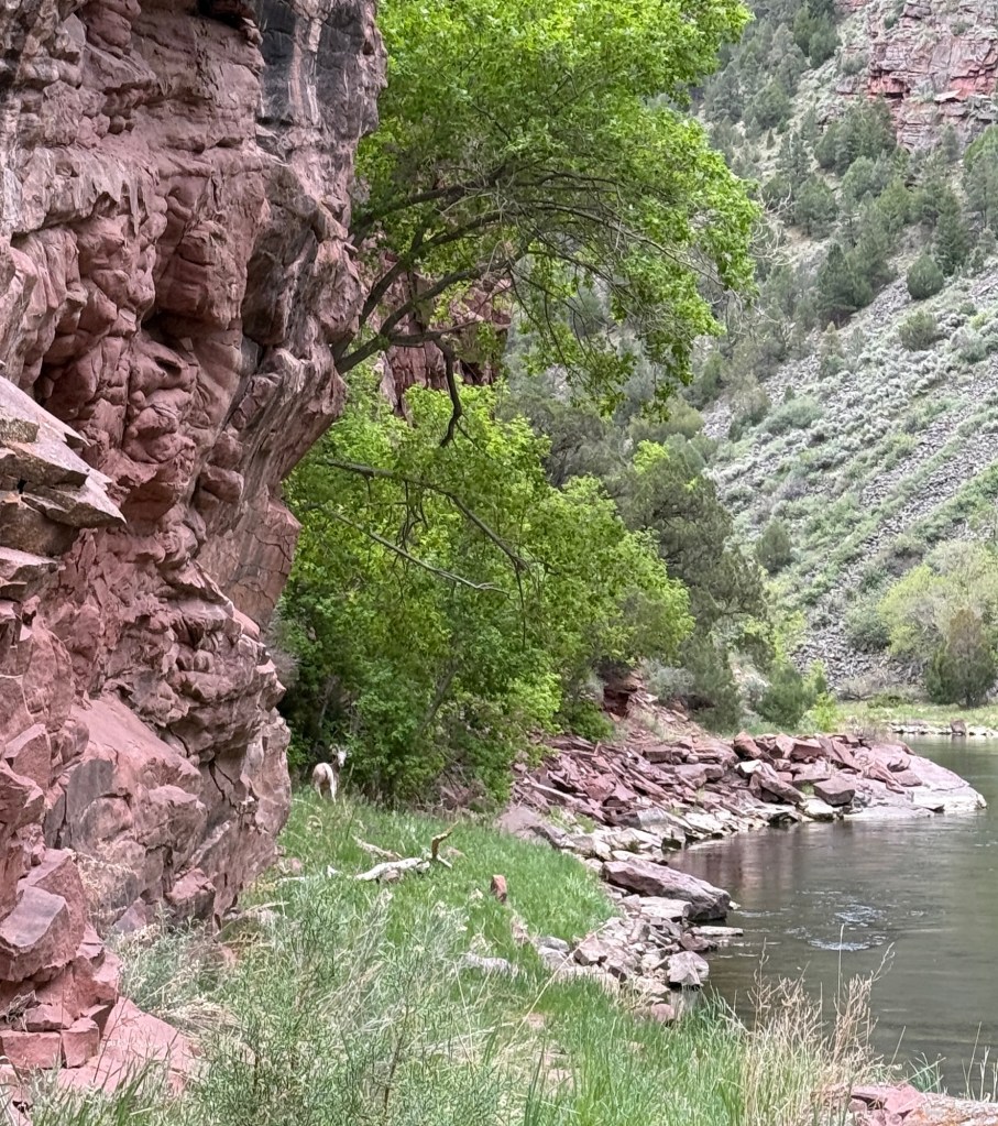 My big goal was to see a Rocky Mountain Bighorn Sheep. They were essentially wiped out by hunting and diseases from domesticated sheep, but were reintroduced in the 1980s. I got my wish somewhat unexpectedly as a single sheep was apparently grazing about head high on the cliff wall when I startled it and it startled me. It took off a ways down the trail pretty quickly, almost as quickly as the Jack Russel Terrier in the nearby boat started losing its mind.