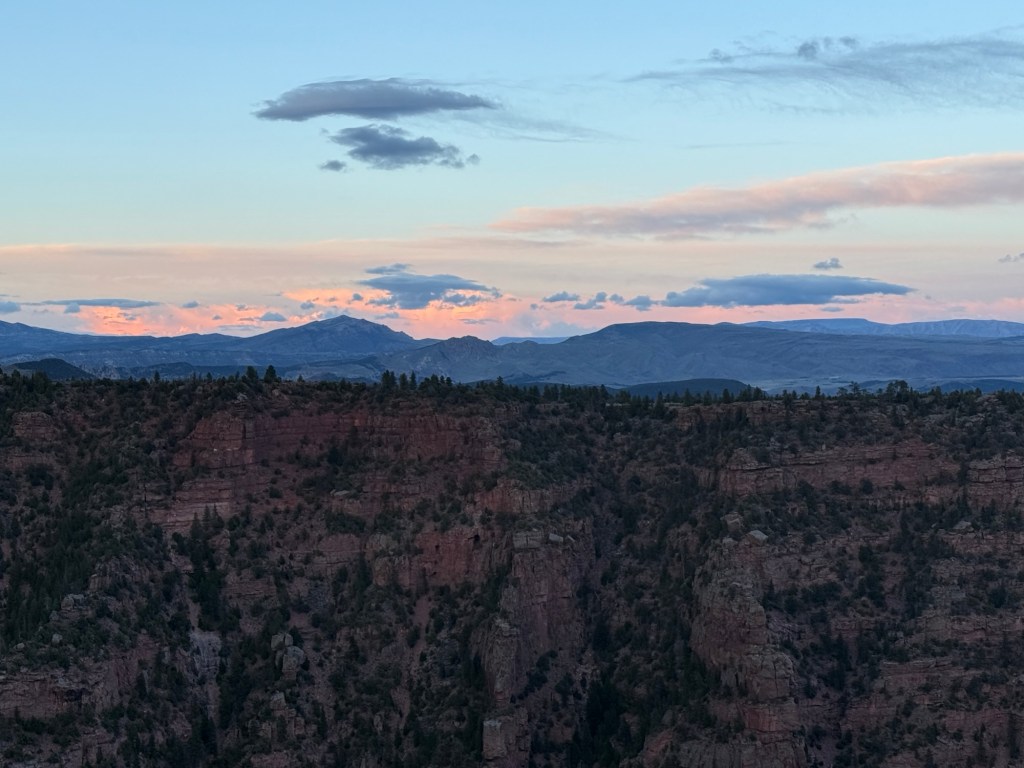I took a spin over to the Red Canyon Overlook for sunset this evening. It was pretty darn chilly and windy, but the clouds mostly cooperated for the first time this trip despite the rain earlier today. Finally my poor little nose couldn’t take the biting wind anymore and I came back for dinner, an episode of Mythic Quest and bed.