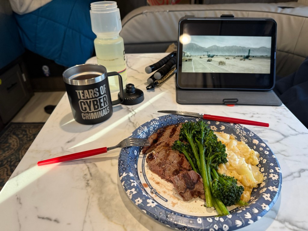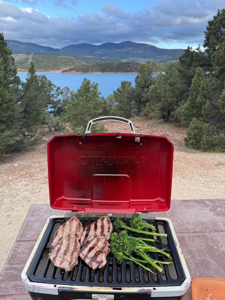 Wind chill at about 33, making things a bit chilly outside, but I still managed to fire up the grill. Dinner turned out pretty well all things considered. I grilled a couple of petite filets and broccolini overlooking Flaming Gorge reservoir, and paired with scalloped potatoes, and Old Fashioned and a Jake Gyllenhaal movie.
