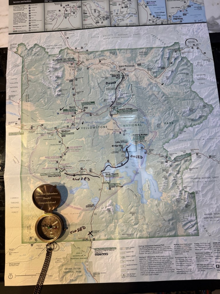 When I first planned out the trip I expected a short 1.25 hour drive between campgrounds. I did not realize that the direct route usually doesn’t open until mid-May due to weather conditions going through the higher passes. When I first arrived at Yellowstone I was given a list of closed roads and attractions, and put them on the map.