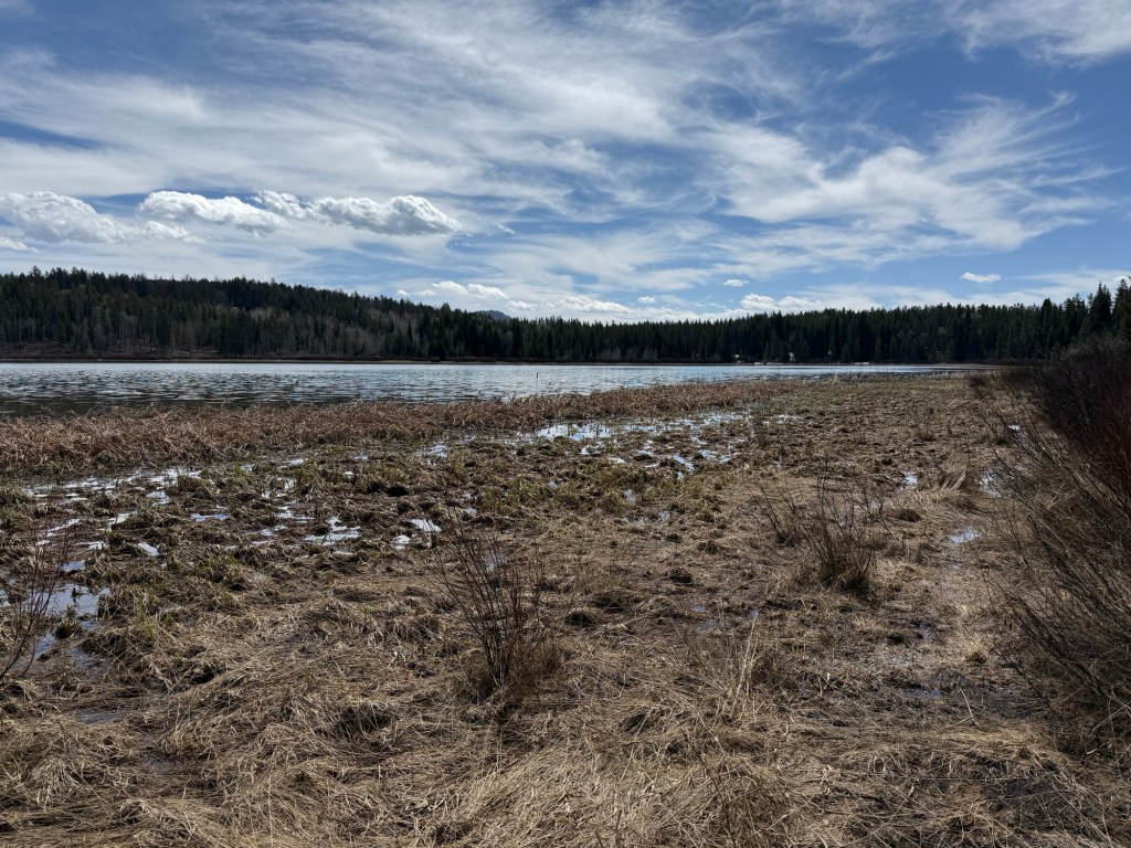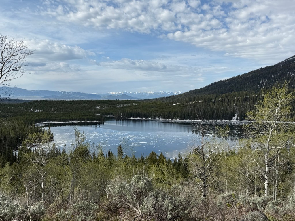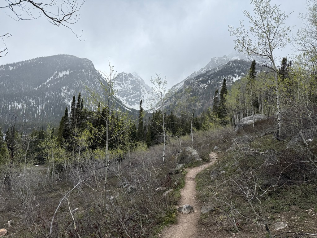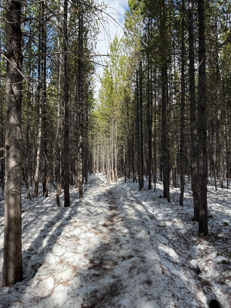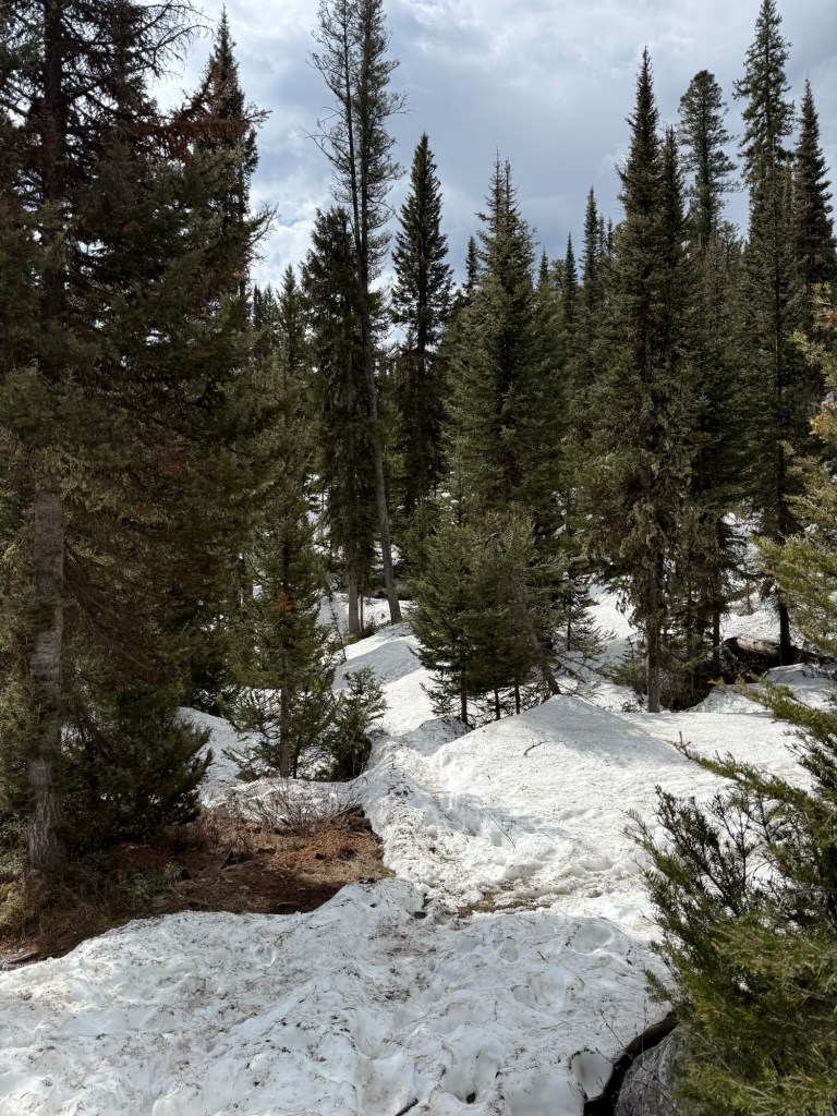 Anyway, I made it to the trail that leads up to Two Ocean Lake, which mostly winds through Aspen groves and meadows, with no snow! There was a lot of runoff from the melting snow, but my On waterproof boots handled with well. There were tons of tracks, deer and raccoon(?), but no signs of animals for almost the rest of the hike. I did repeatedly hear what sounded like a generator trying to start up – I figured I was suffering trauma from the RV issues. Turns out that is the sound of the ruffed grouse. So I almost make it up to Two Oceans Lake, but the trail heads back into the pines and the snow starts piling up again. Nope. Can barely feel my legs as it is, not going through that again!
