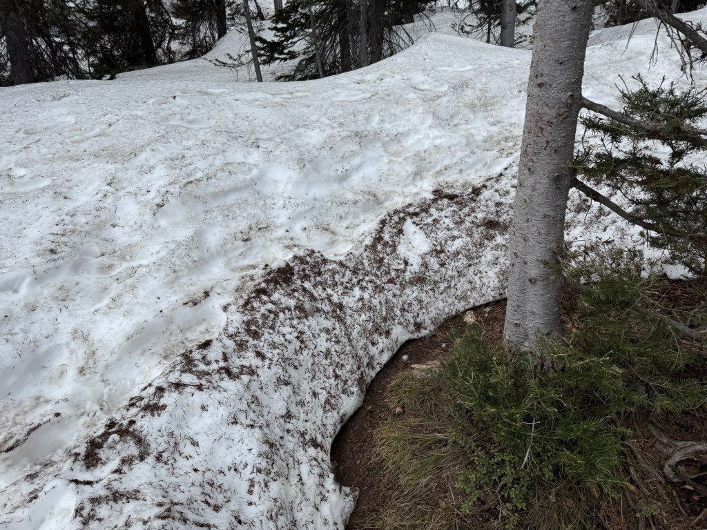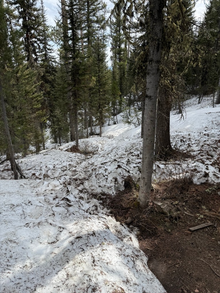The path along Lake Taggart meandered through a dense pine forest, which provided enough shade for there to also be a pretty thorough snow cover, but at least it was flat and well traveled, so much easier to follow if not so easy to walk on. But I was able to make it back above Lake Taggart and tried to push my way to Lake Bradley as the trails merged above the sketchy part I that turned me around. I also met a few groups that kept going and were coming down, so it was clearly passable. So I pushed on the try to get to Lake Bradley. I made it about another.3 miles, being more confident walking in the snow, but eventually decided again the risks weren’t worth it. Also, I stopped to put on more sunscreen and within 5 minutes clouds started cresting the mountains. So I turned back again.