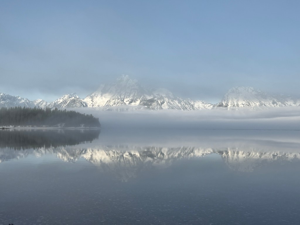 Has a nice long hike this morning, even though I didn’t get quite to the lake I was aiming for. The weather was incredibly, about 50 and sunny to start out, getting just a bit warmer as the morning went on. I made it about 75% of the way to Bradley Lake, and had a great view of Taggart Lake below, unfortunately the snow started piling up and I want confident in just winging it on my own, so I turned around and headed back to walk along the shore of Lake Taggart to see of that way up was any better. You can’t really tell by the picture, but the snow was about 3 feet deep for extended periods, and with the changes in terrain and slope being impossible to determine it just seemed to risky for me.