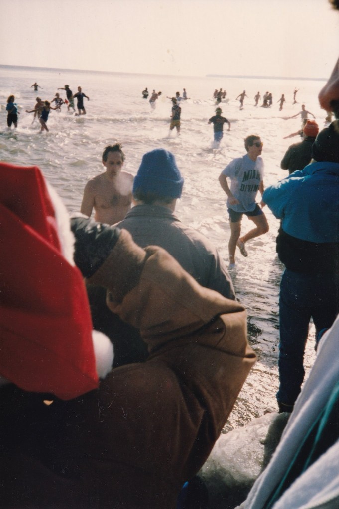 I just got back from a walk to the lake and was lucky enough to see a young couple take a quick swim. I was calling the lunatics in my head, but remembered I did the Polar Bear Plunge at Bradford Beach in Milwaukee (probably 1992) when the air temp was single digits. To be fair I was probably a lunatic for doing it back then as well. I’m the one in the Miami Diving t-shirt in case you didn’t recognize me with hair, and 30 years younger…